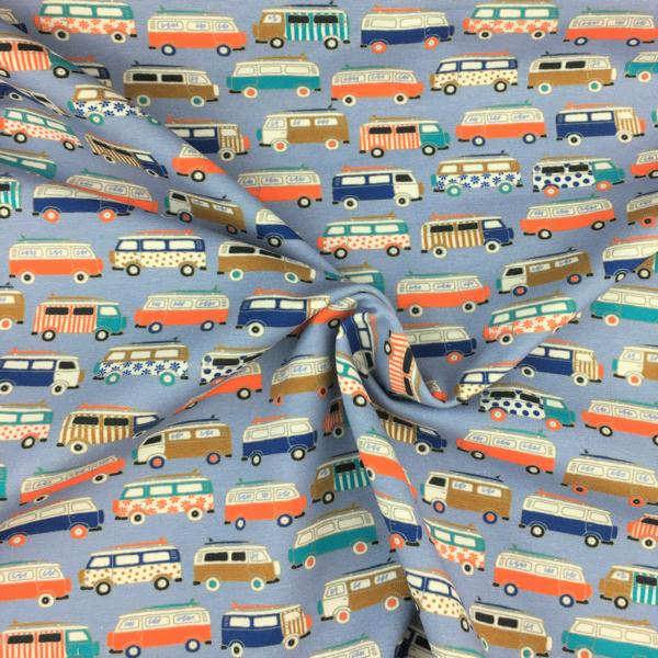 Für große und kleine Hippies: Weicher feiner Baumwolljersey von Hilco, hellblau, bedruckt mit Campingbussen/Bullies in orange, blau, oliv, weiß.