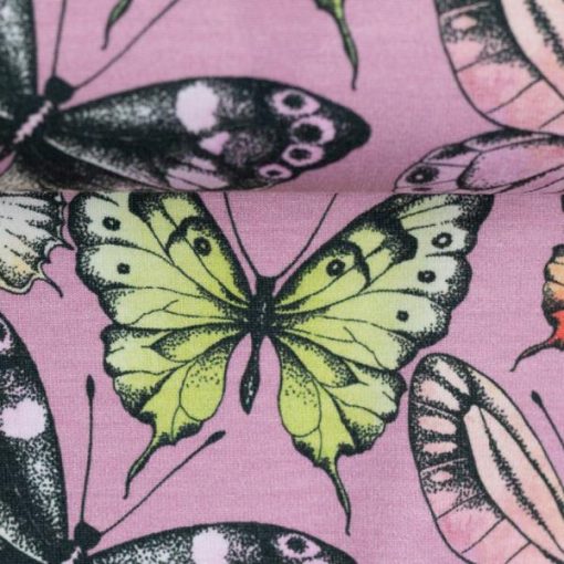 Baumwolljersey von Swafing mit bunten Schmetterlingen auf rosafarbenem Untergrund. Der größte Schmetterling hat ca. einen Durchmesser von 9cm.